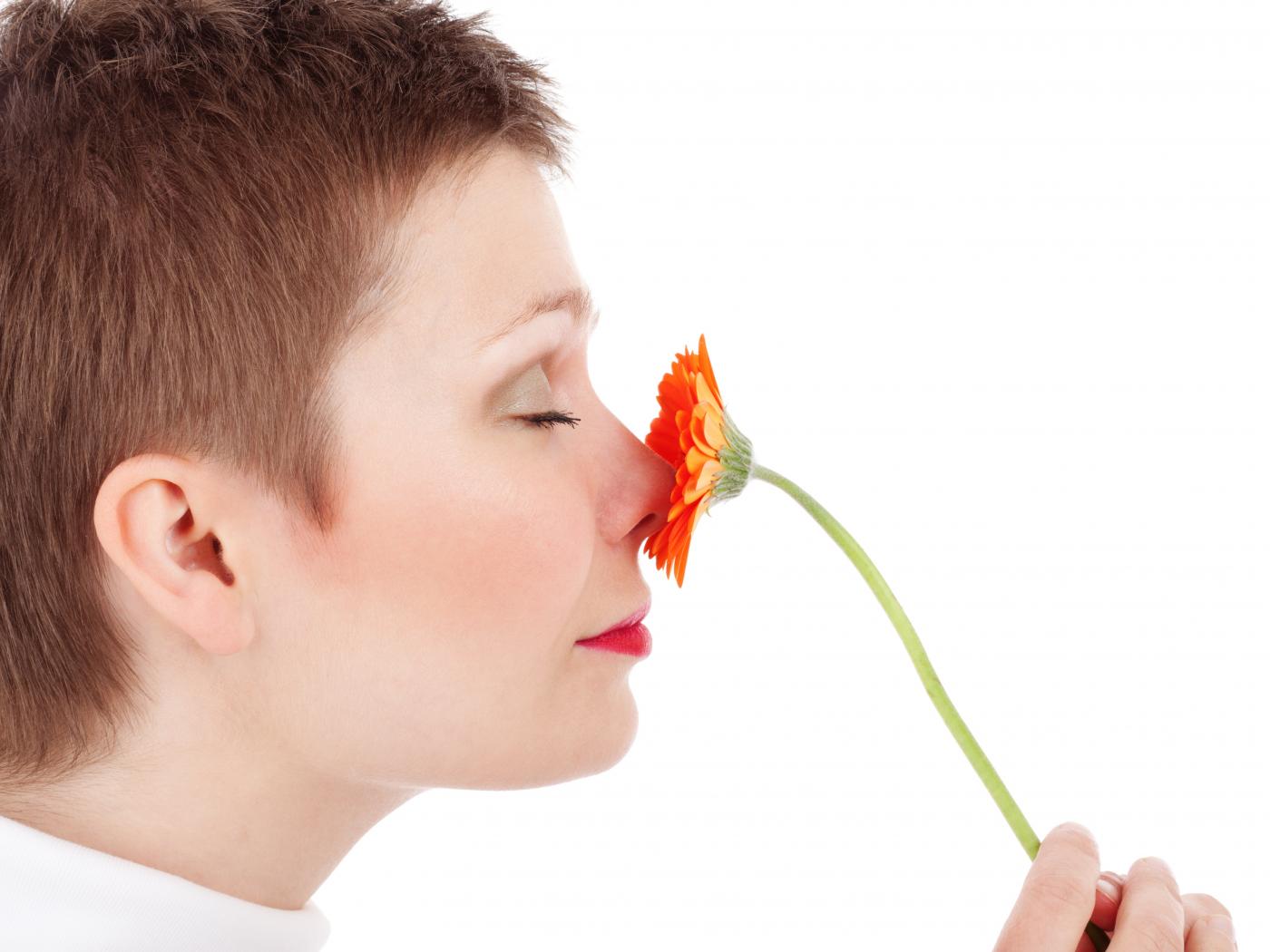 Wallpaper Woman with closed eyes with gerbera flower in hand