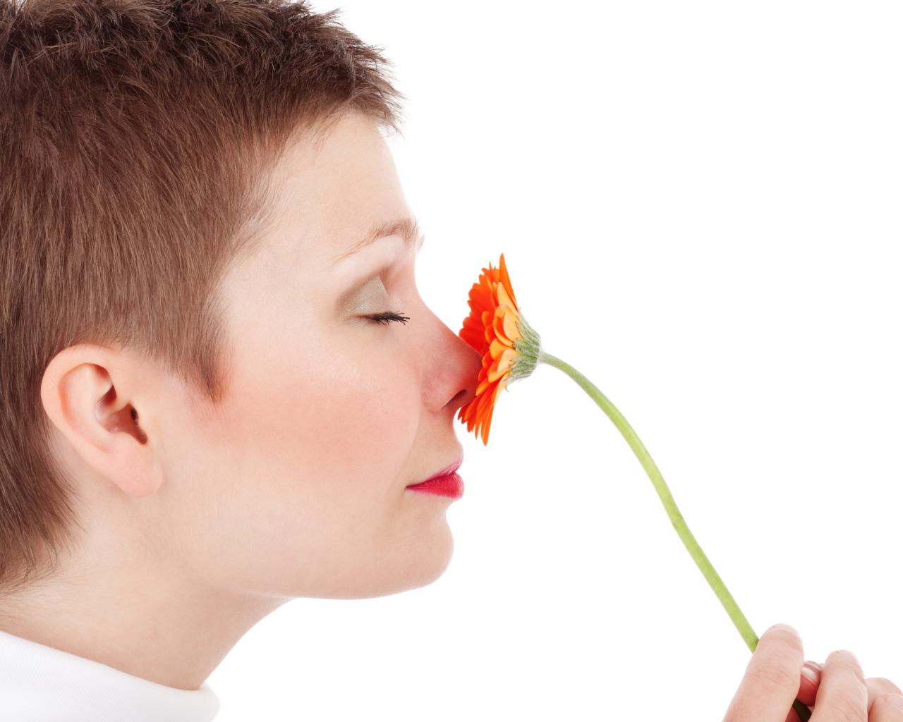 Wallpaper Woman with closed eyes with gerbera flower in hand