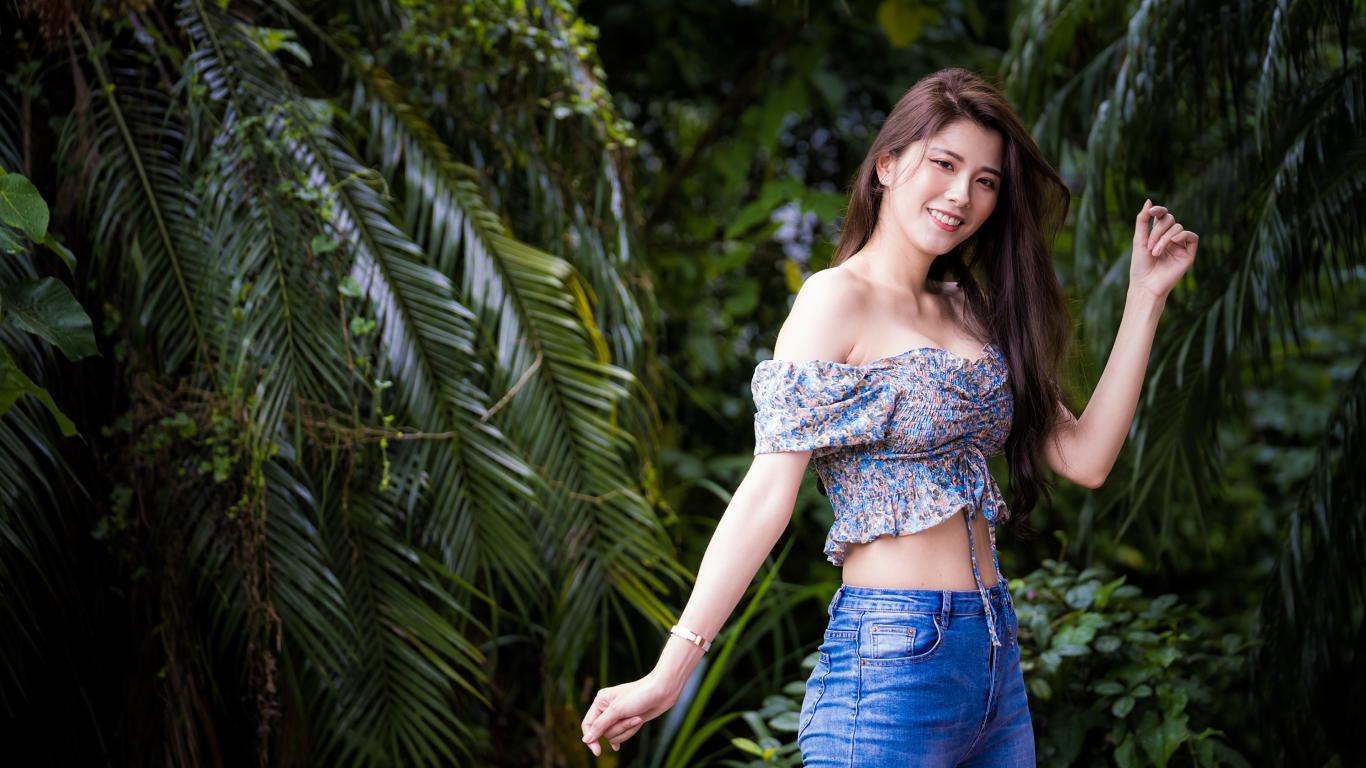 Wallpaper Smiling asian woman on background of green leaves