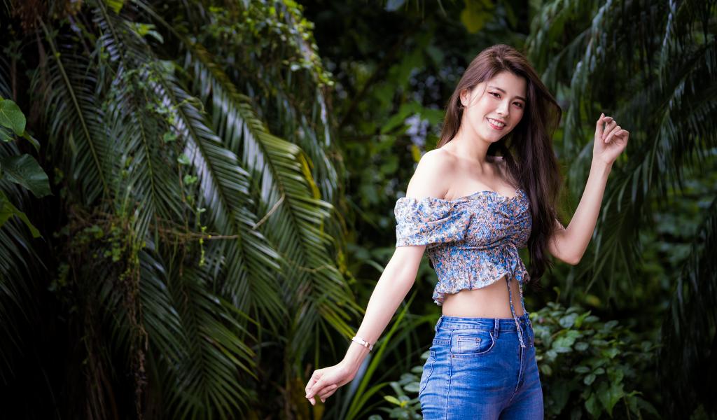 Wallpaper Smiling asian woman on background of green leaves