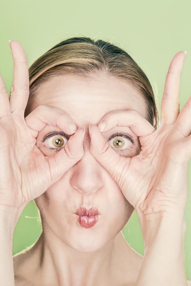 Wallpaper Funny girl makes glasses on her face with her hands
