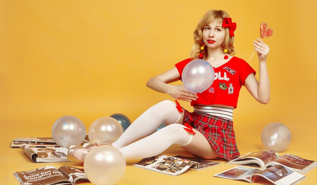 Wallpaper Girl with balls and magazines sitting on the floor