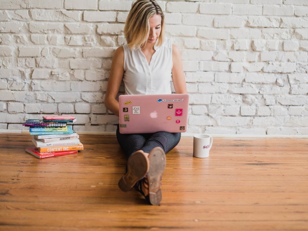 Wallpaper Young girl student with laptop and books near the wall