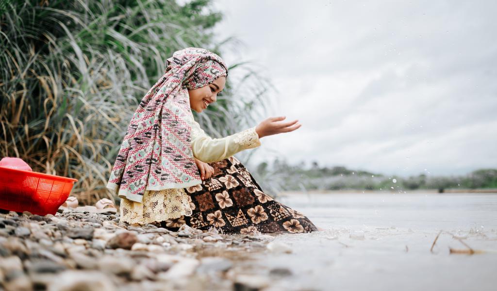 Wallpaper Smiling asian girl sitting by the water
