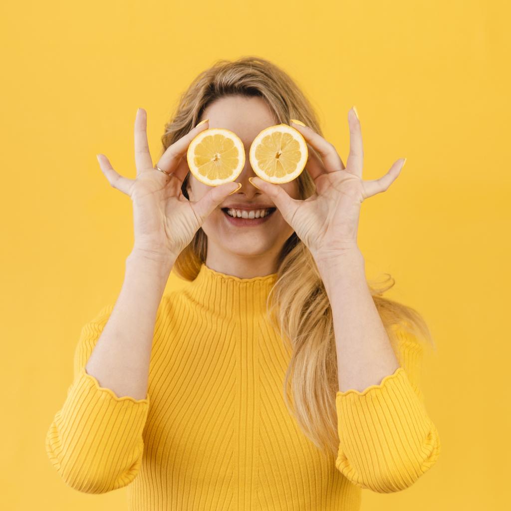 Wallpaper Beautiful girl in a yellow sweater with lemon
