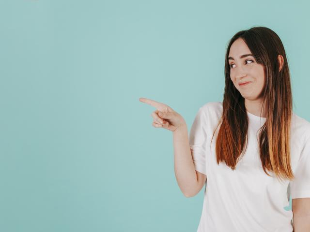 Wallpaper A girl in a white T-shirt points her finger at someone