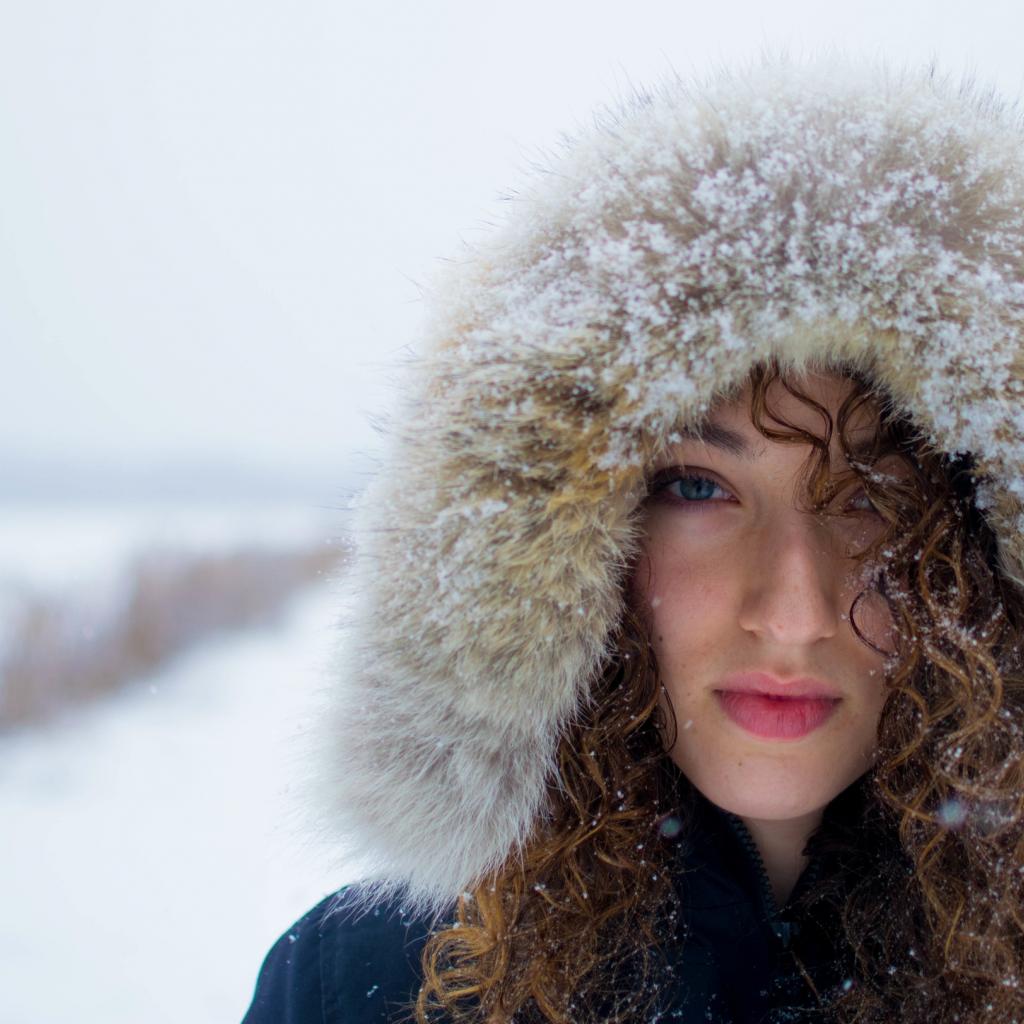 Wallpaper Girl in a snow-covered hood on the street