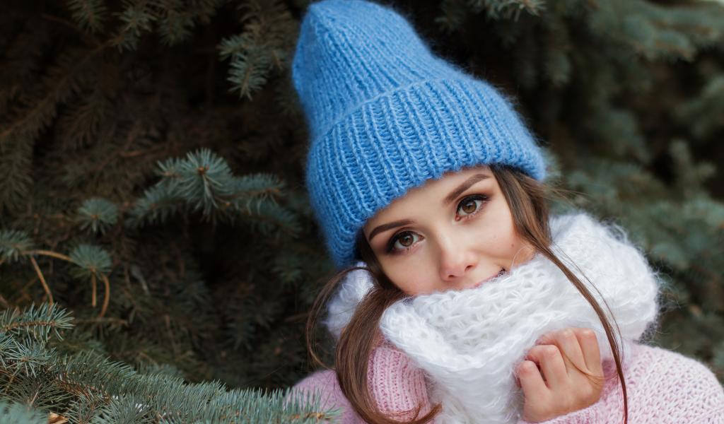 Wallpaper Girl in a blue knitted hat by the fir