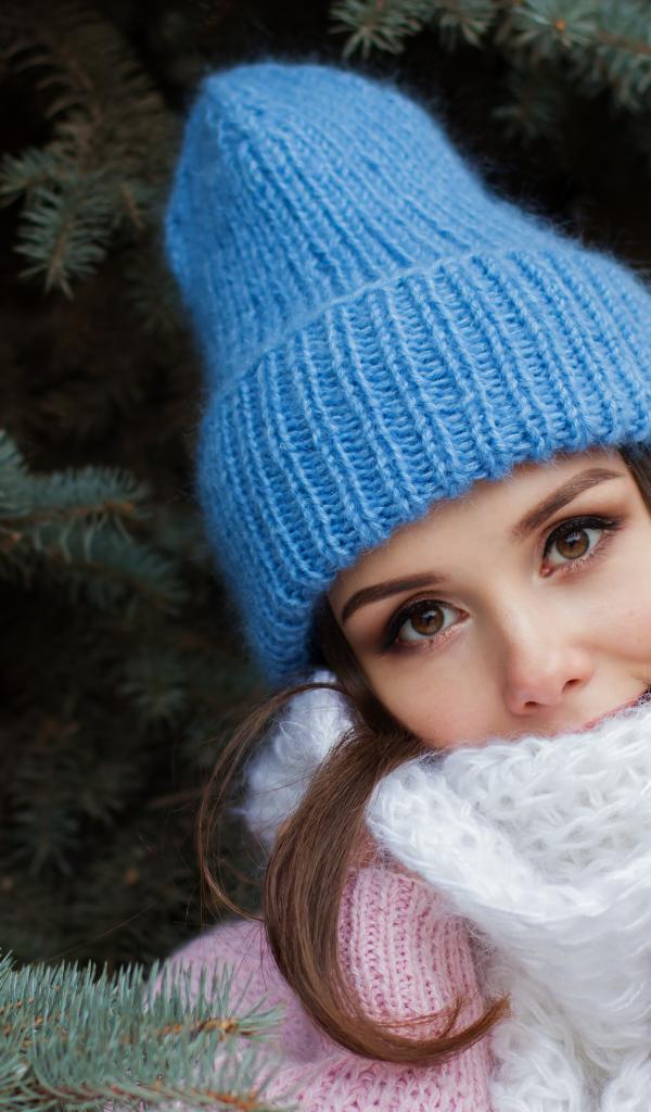 Wallpaper Girl in a blue knitted hat by the fir