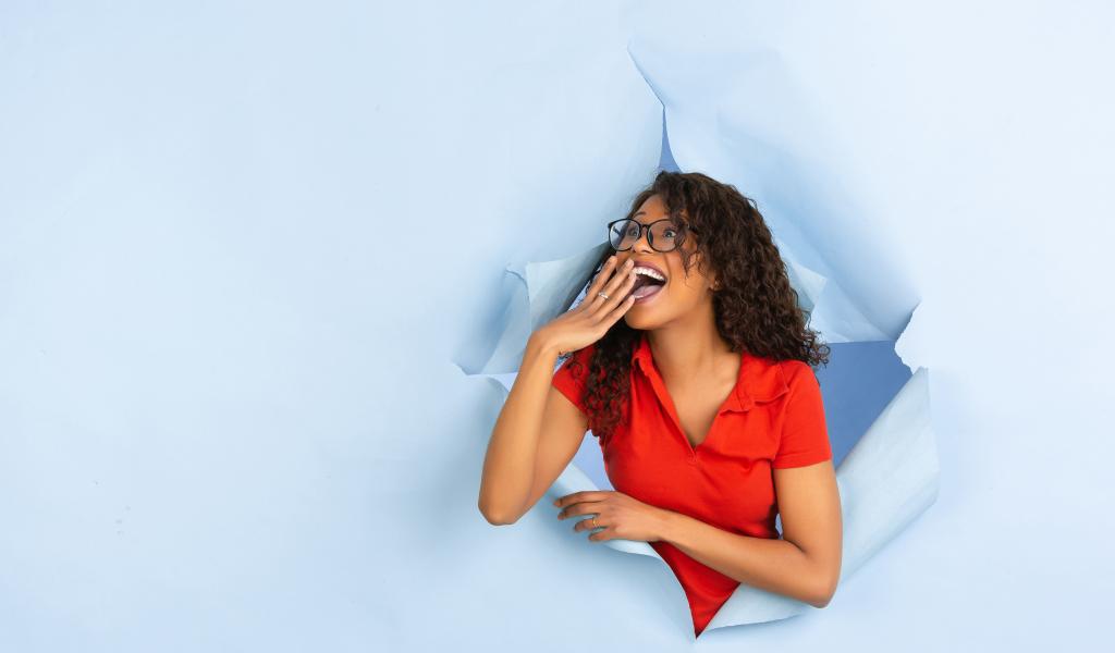 Wallpaper Joyful girl broke a hole in the wall