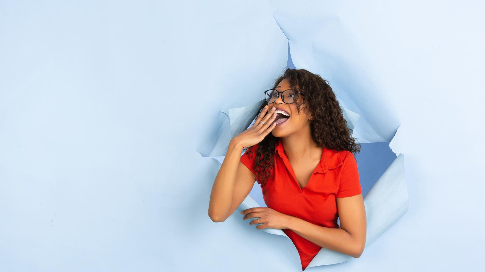 Wallpaper Joyful girl broke a hole in the wall