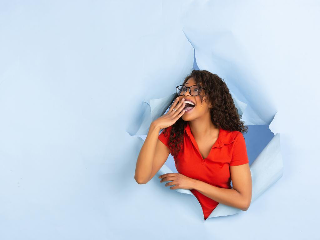 Wallpaper Joyful girl broke a hole in the wall