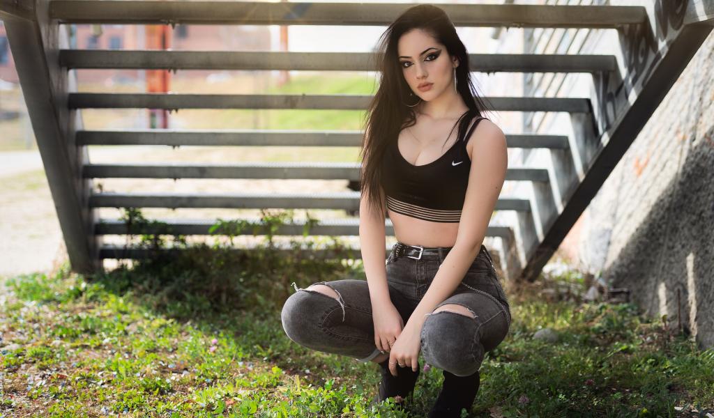 Wallpaper Beautiful girl sitting under the stairs