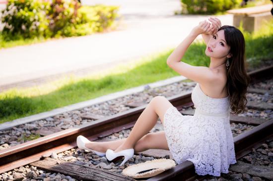 Wallpaper Young Asian woman in white dress sits on the rails