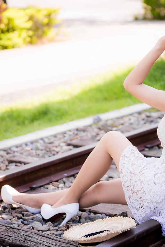 Wallpaper Young Asian woman in white dress sits on the rails