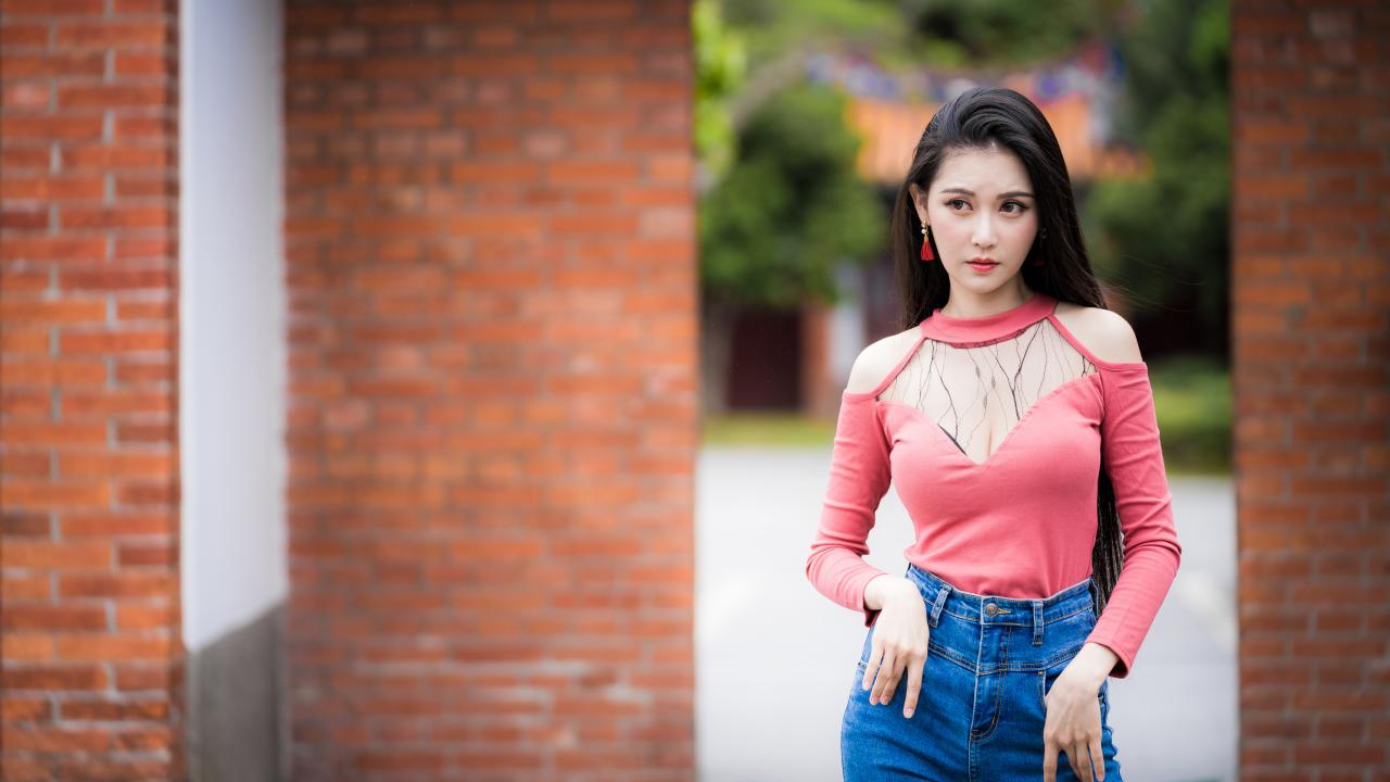 Wallpaper Beautiful asian woman in blue jeans sits on the ground