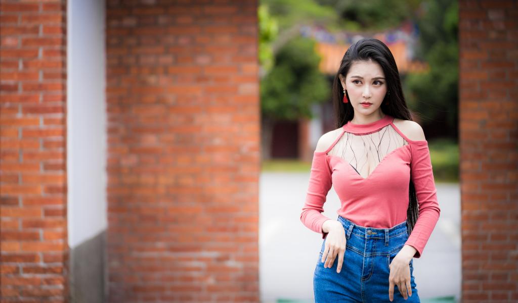 Wallpaper Beautiful asian girl in blue jeans