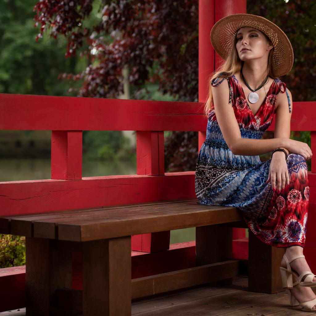 Wallpaper A young girl in a dress sits on a bench