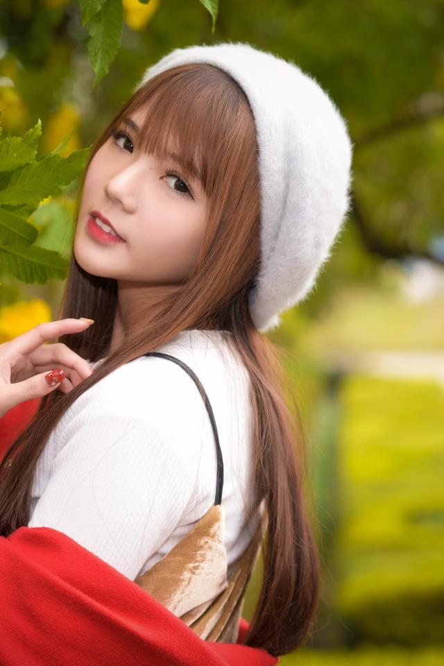 Wallpaper A girl in a beret stands by a bush with yellow flowers