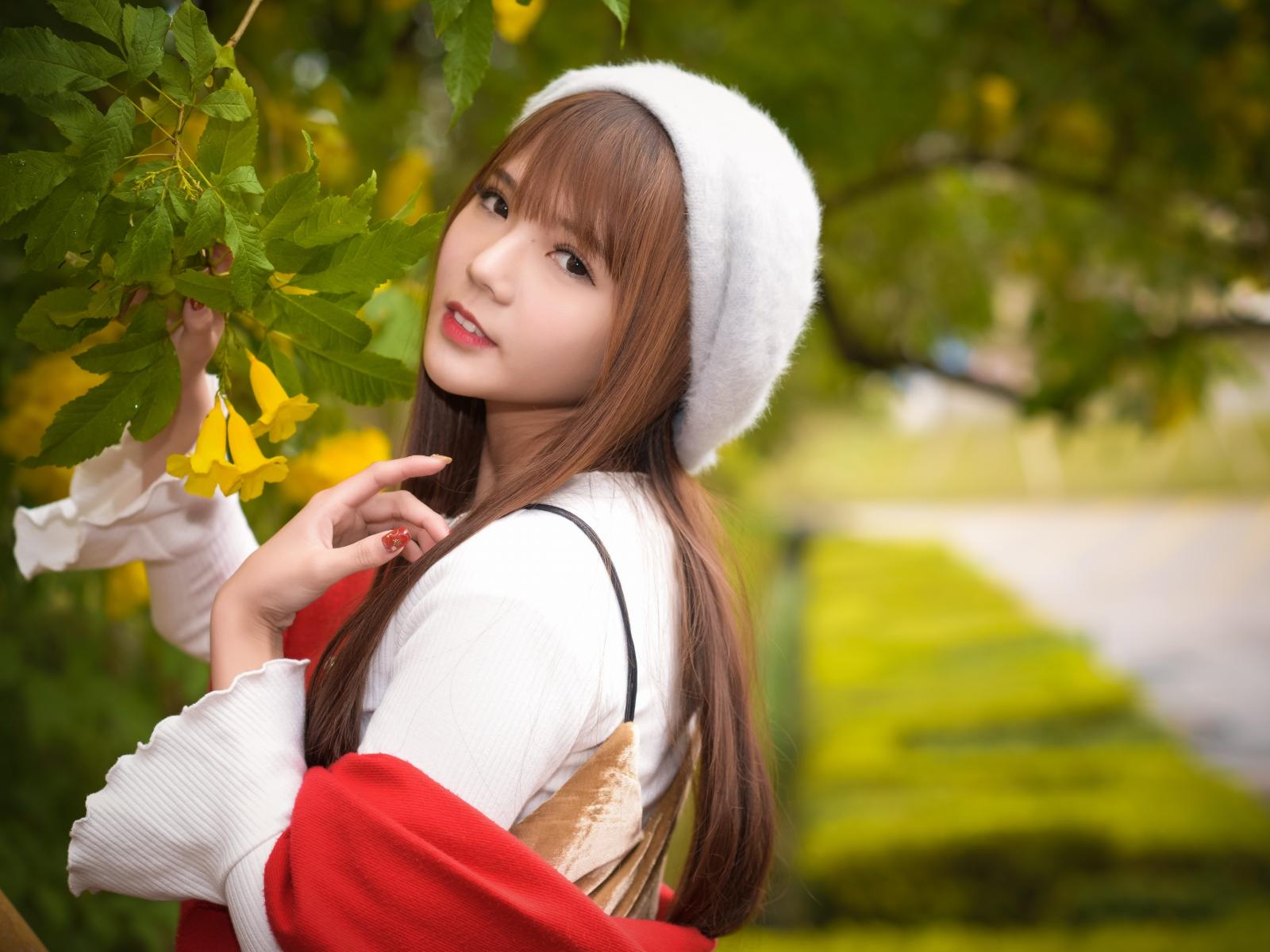 Wallpaper A girl in a beret stands by a bush with yellow flowers