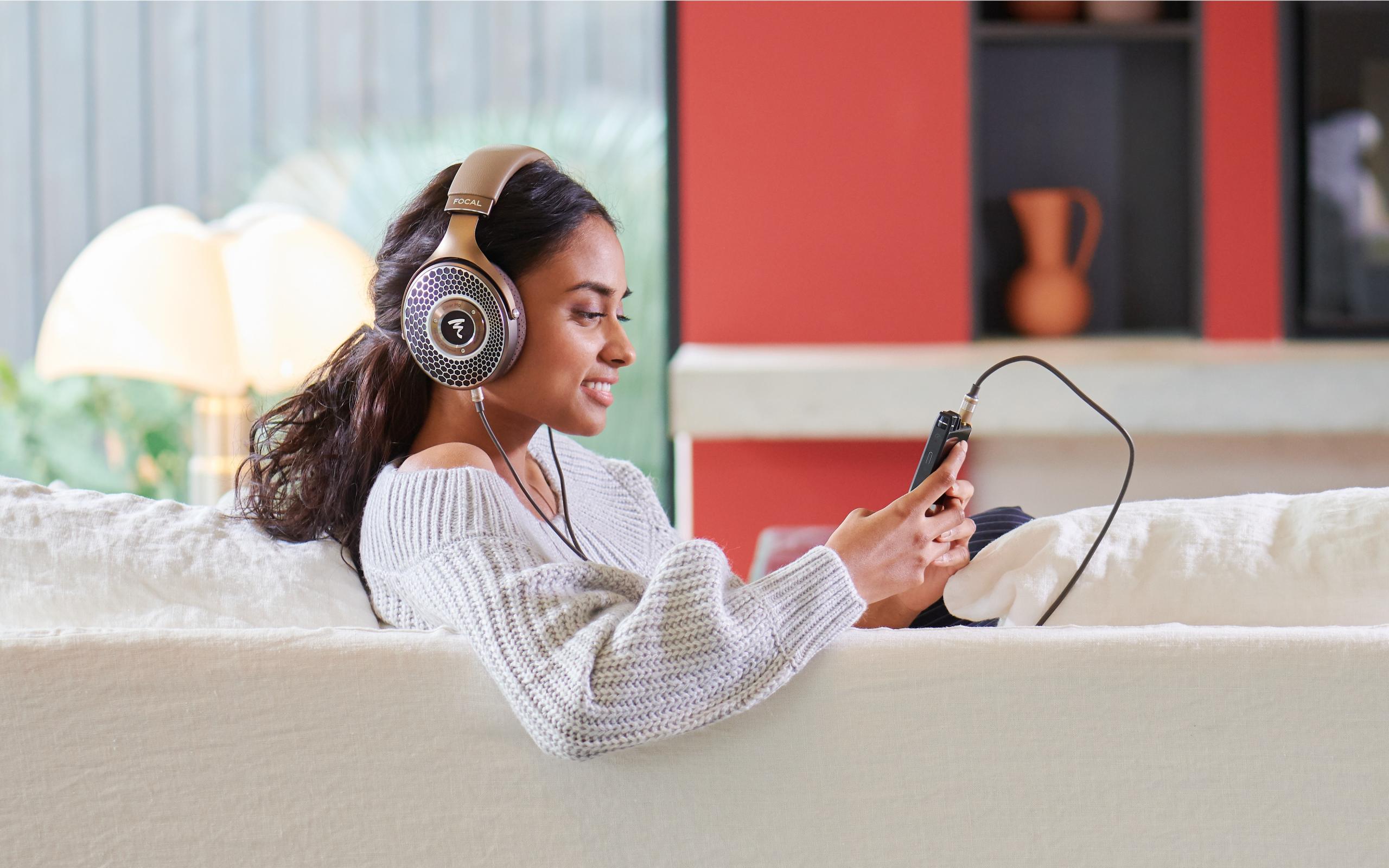 Wallpaper Girl model in headphones on the couch with a player