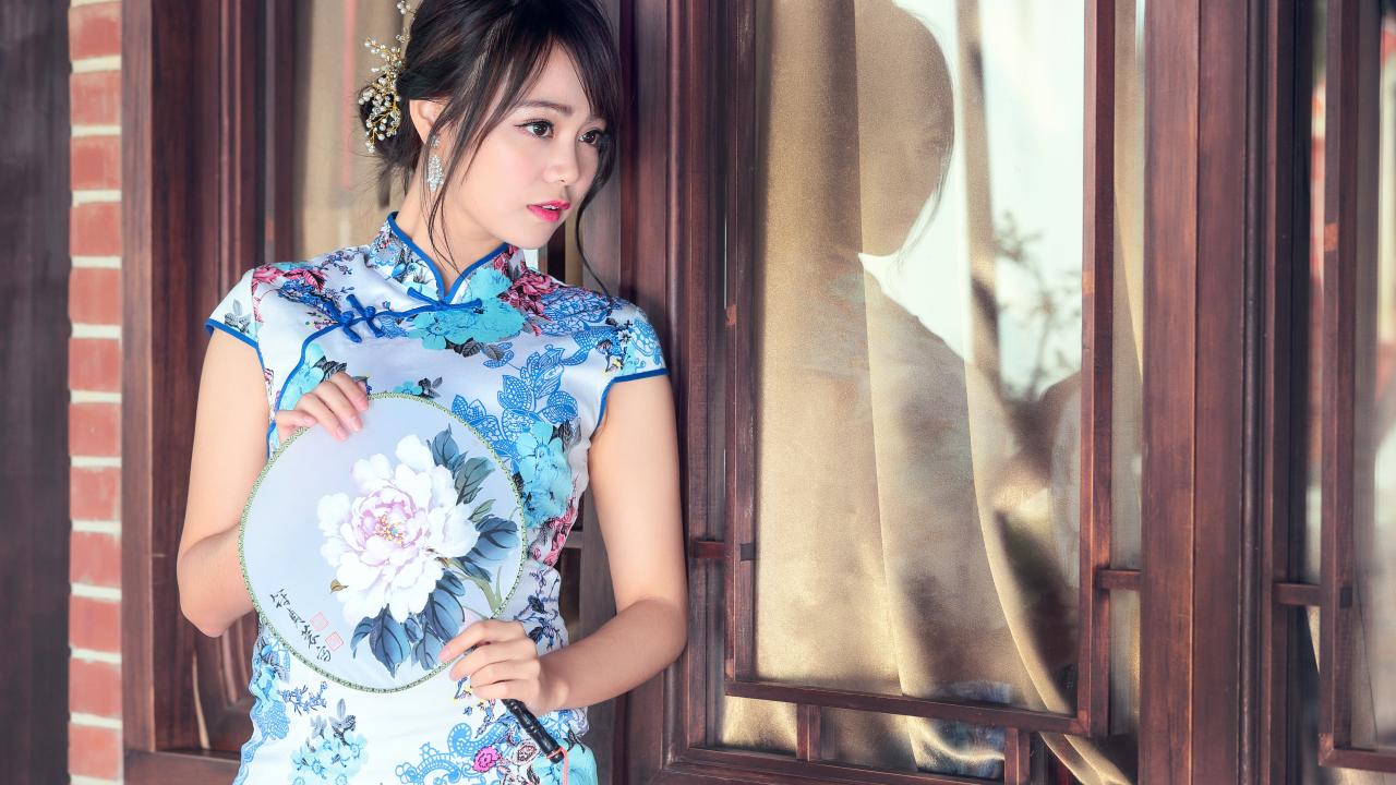 Wallpaper Asian girl in a beautiful dress stands by the window