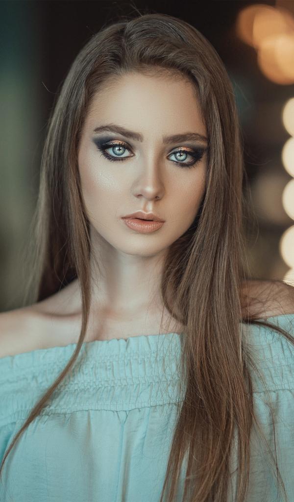 Wallpaper Beautiful blue-eyed girl in a dress by the mirror