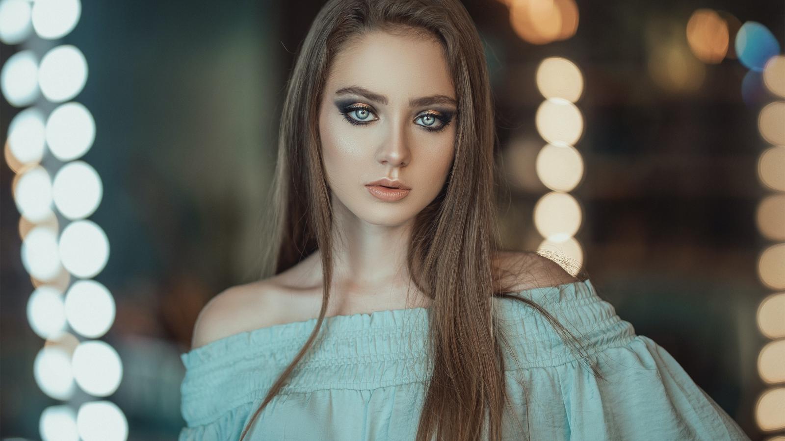 Wallpaper Beautiful blue-eyed girl in a dress by the mirror