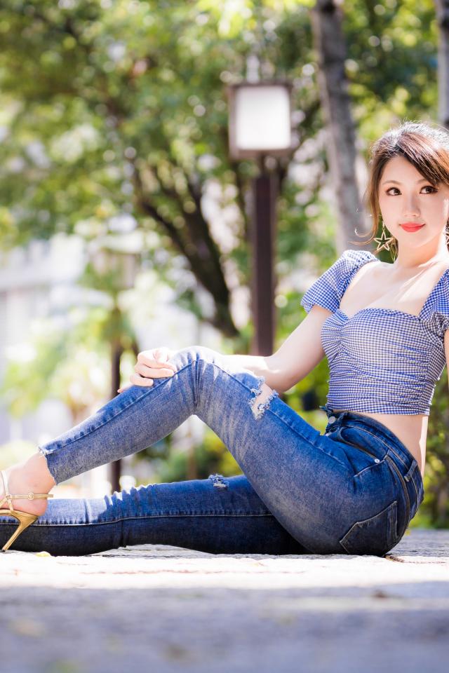 Wallpaper Beautiful asian woman in jeans sits on the ground