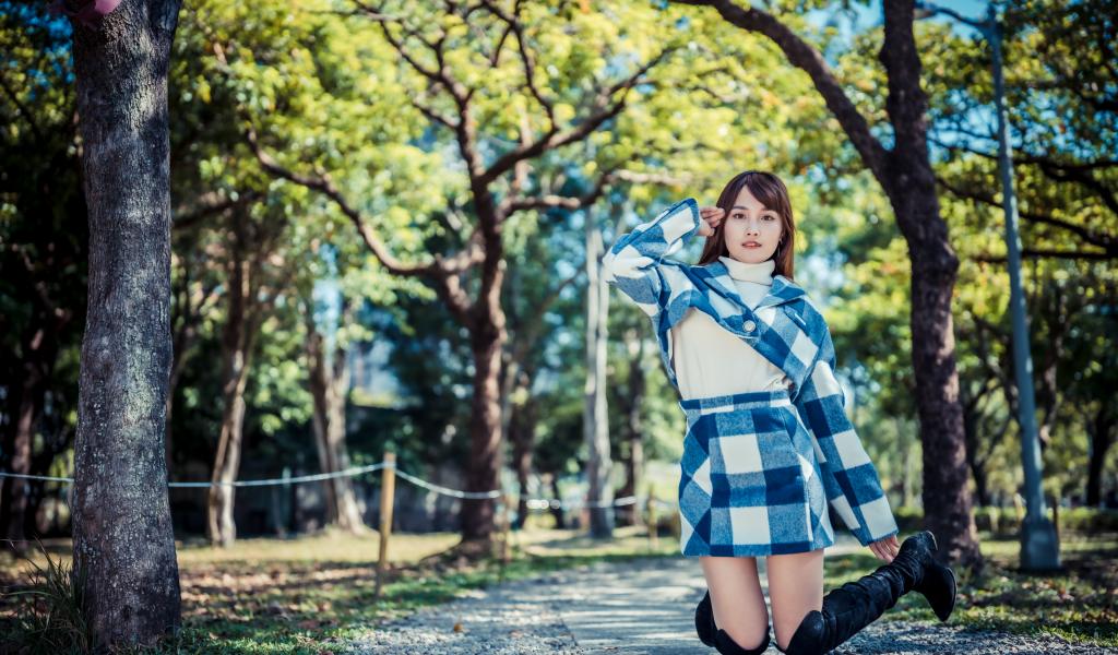 Wallpaper Beautiful asian girl kneeling in the park