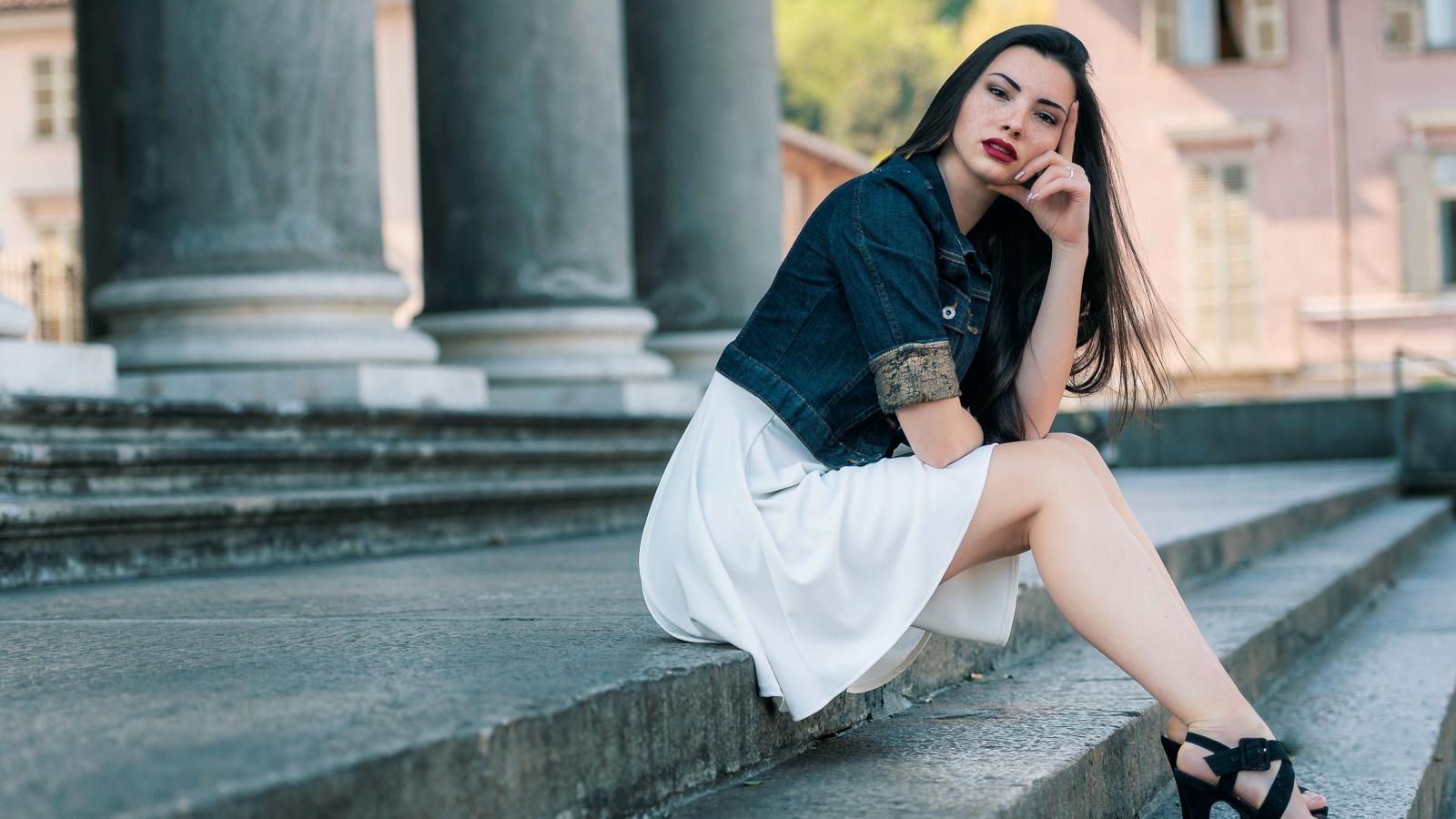 Wallpaper A girl in a white dress sits on the steps