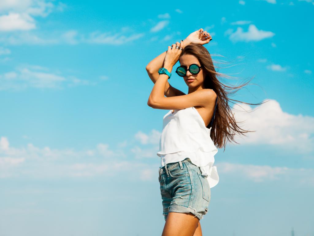 Wallpaper Beautiful girl in shorts against the sky