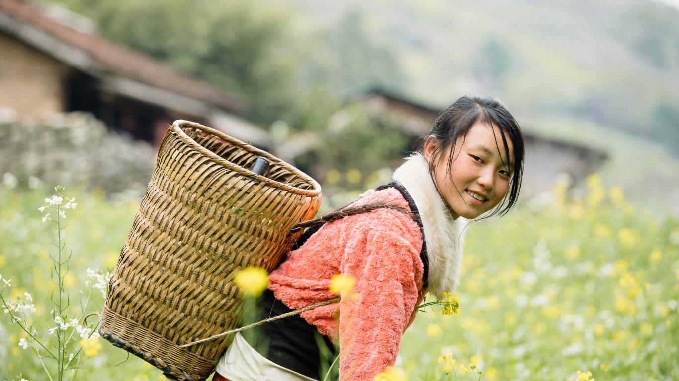 Wallpaper Asian girl with basket on the field