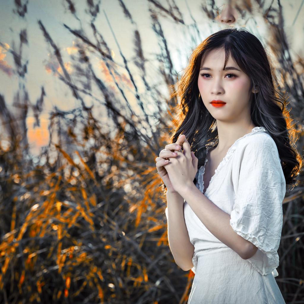 Wallpaper Young asian girl in a white dress at sunset