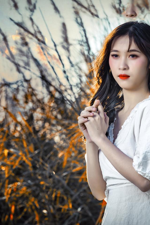 Wallpaper Young asian girl in a white dress at sunset
