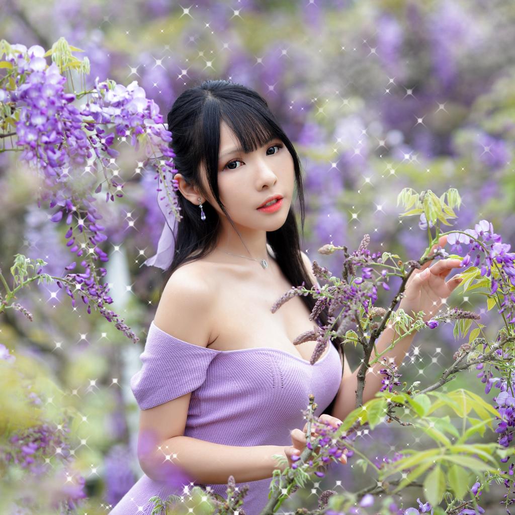 Wallpaper Brown-eyed Asian woman by a bush with wisteria flowers