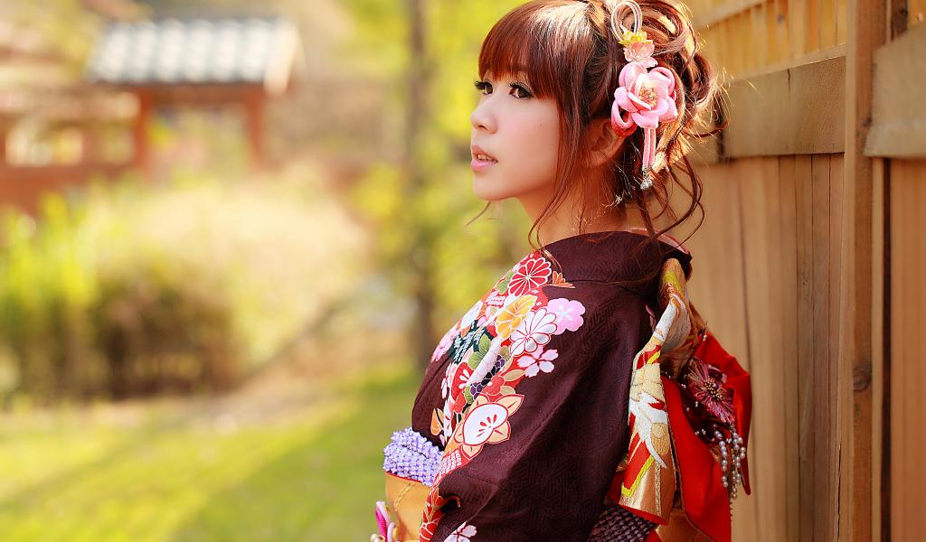 Wallpaper Asian girl in kimono stands at the fence
