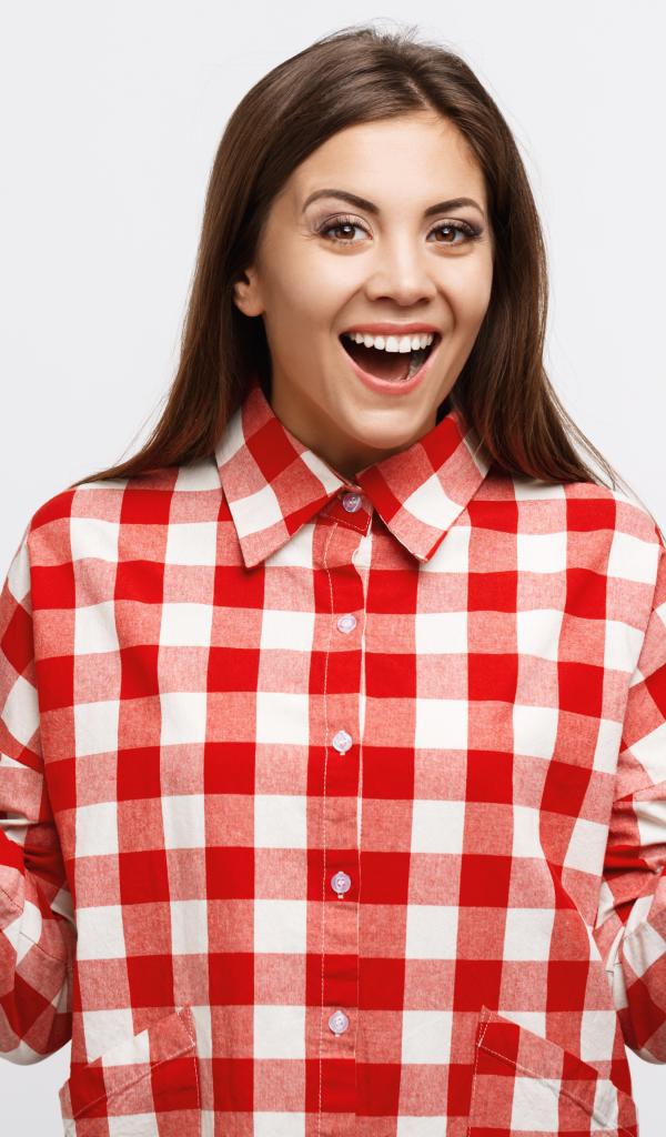 Wallpaper Cheerful girl in a plaid shirt on a white background