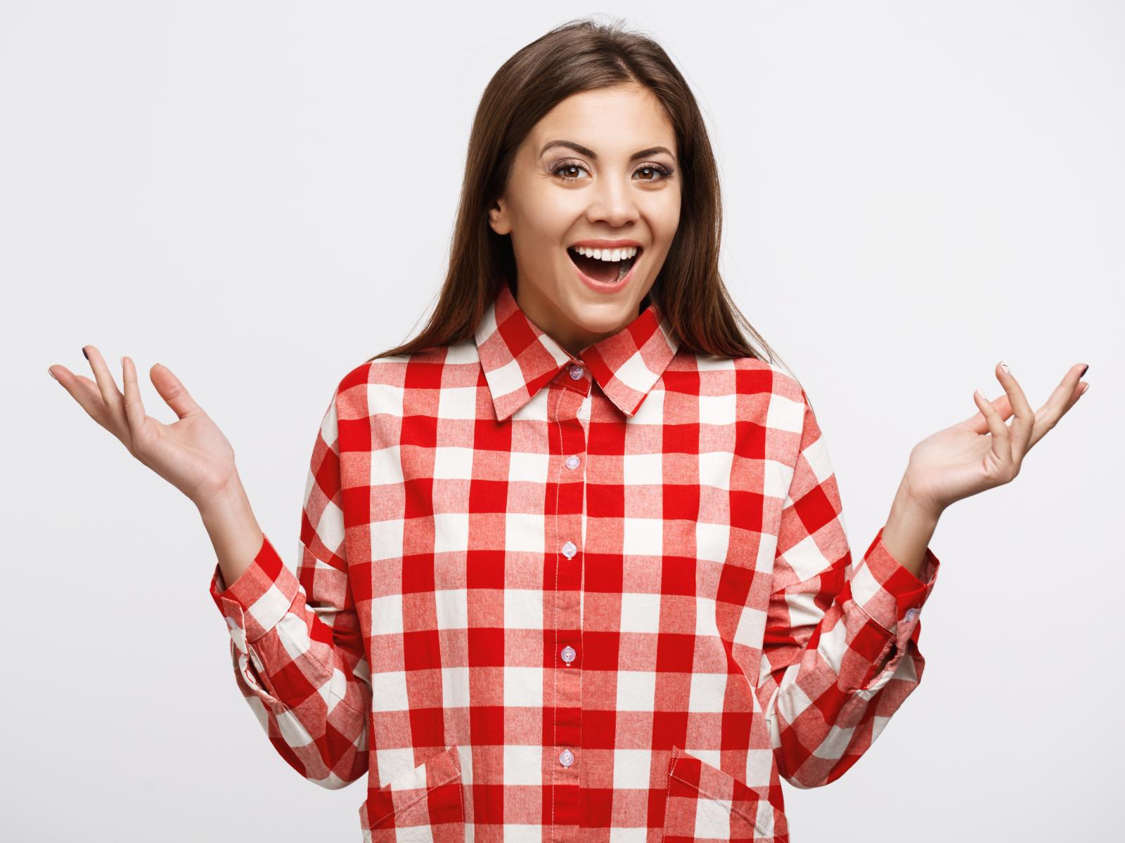 Wallpaper Cheerful girl in a plaid shirt on a white background