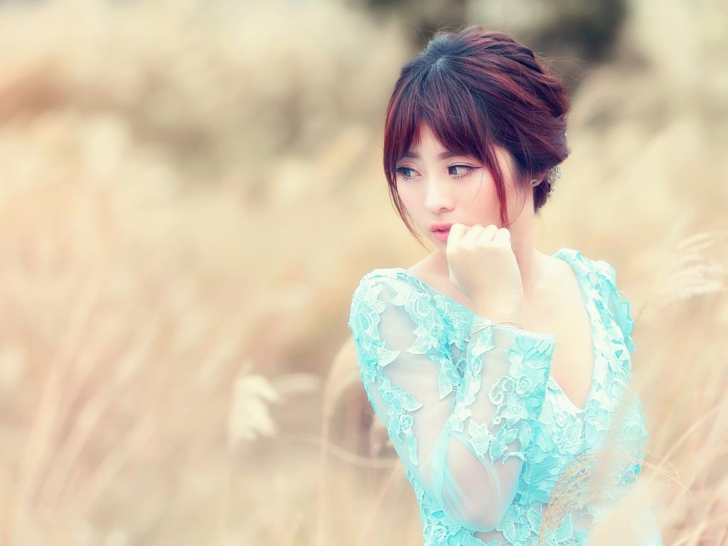 Wallpaper Cute Asian girl in a blue dress sits by a flower bed