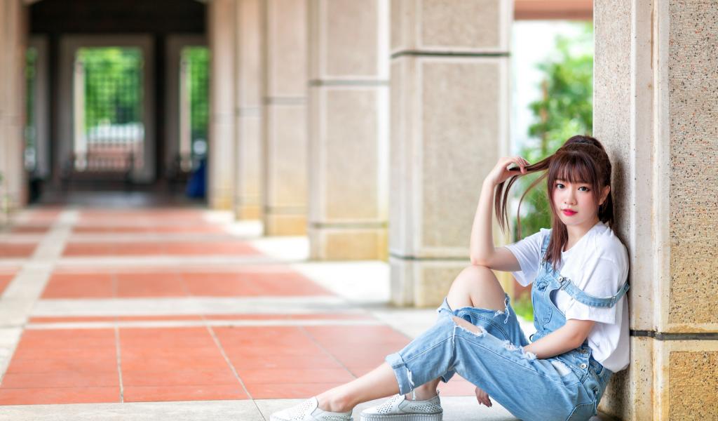 Wallpaper Sad Asian girl sitting by the column