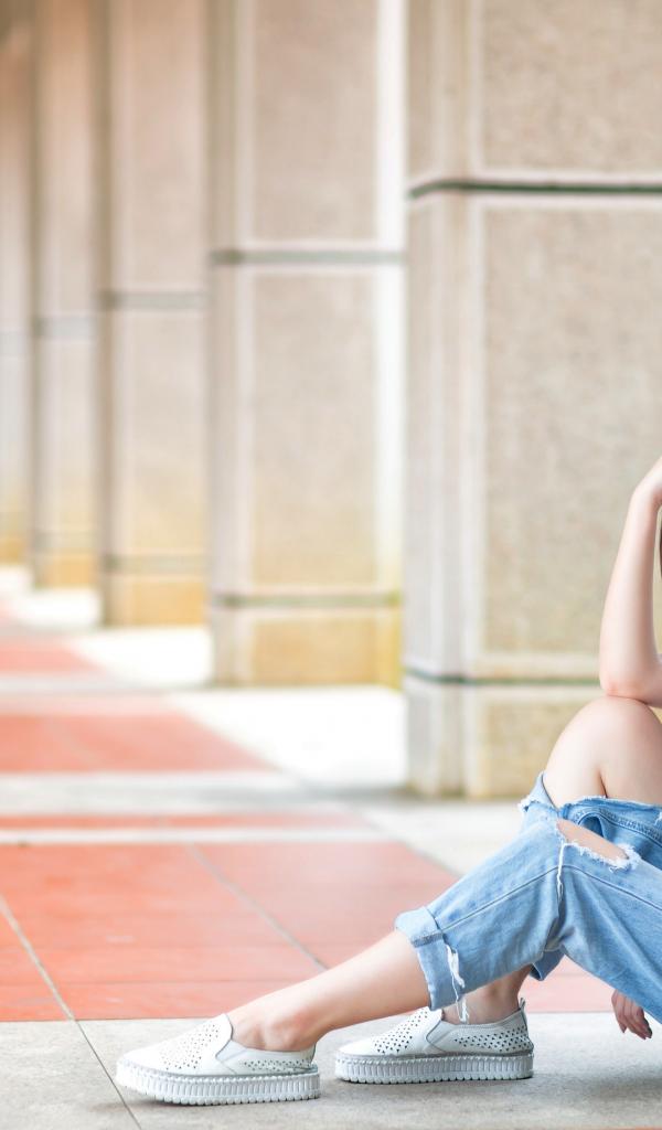 Wallpaper Sad Asian girl sitting by the column