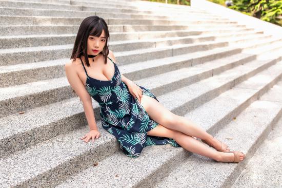 Wallpaper Asian girl in a dress sits on the steps