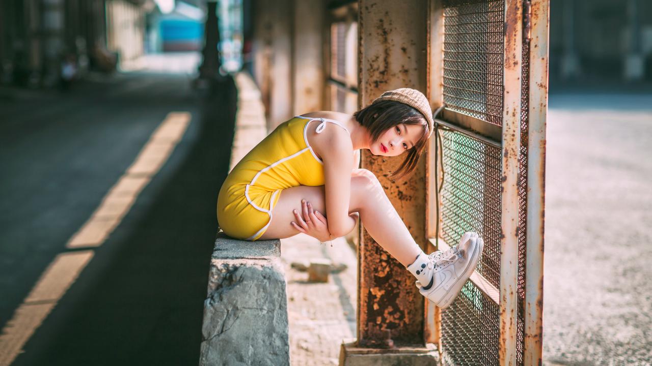 » Wallpaper Young Asian girl sitting by the net