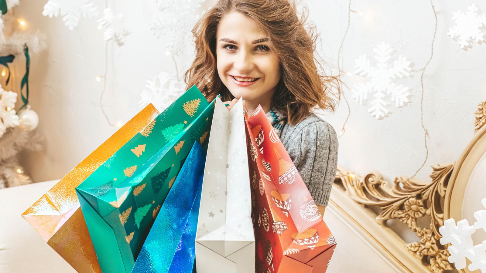 Wallpaper Beautiful girl Snow Maiden with Christmas shopping