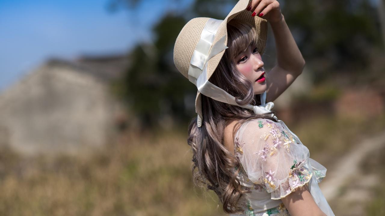 Wallpaper Beautiful asian woman in a hat in the rays of the sun