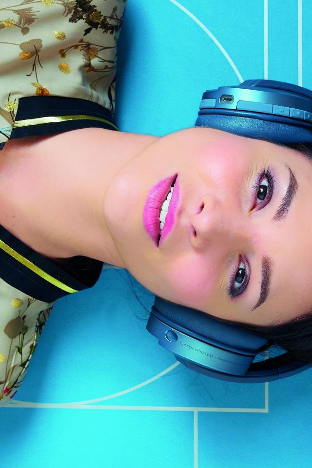 Wallpaper Young woman in headphones lies on the blue floor