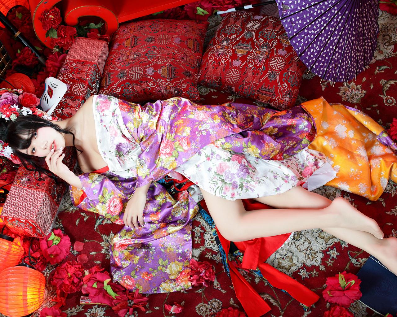 Wallpaper Beautiful asian girl in kimono lies on the floor