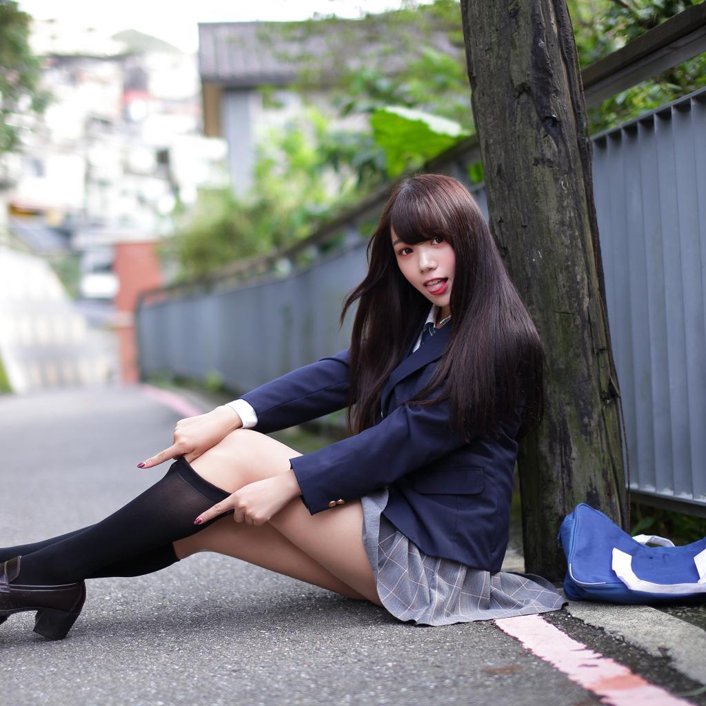 Wallpaper Asian girl in black stockings sitting by a tree