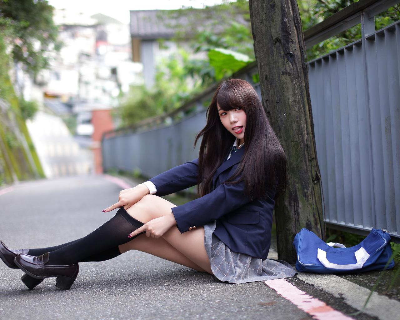 Wallpaper Asian girl in black stockings sitting by a tree